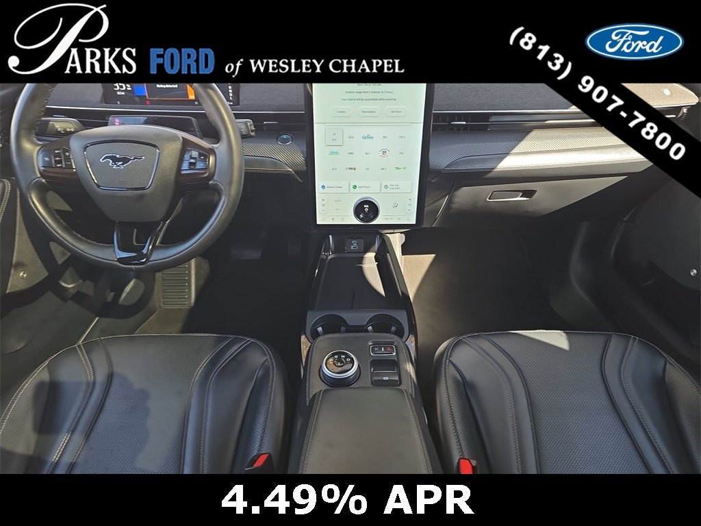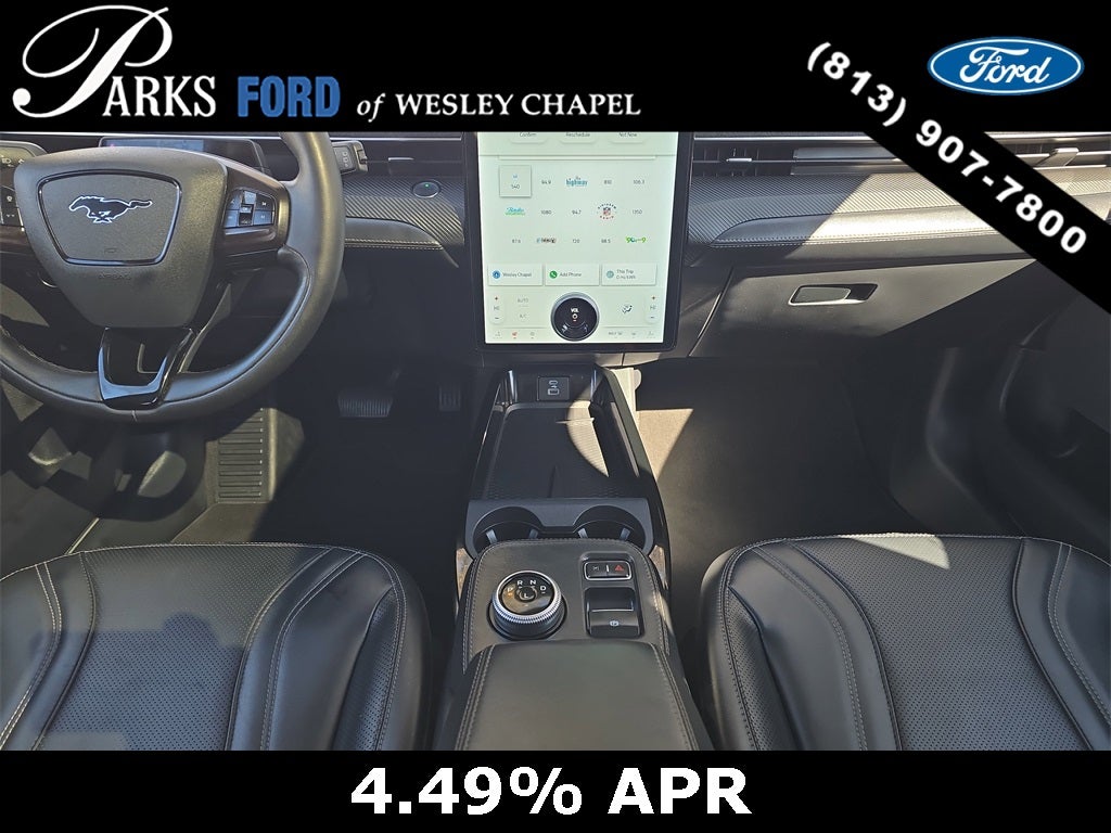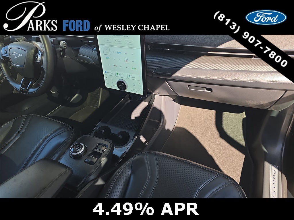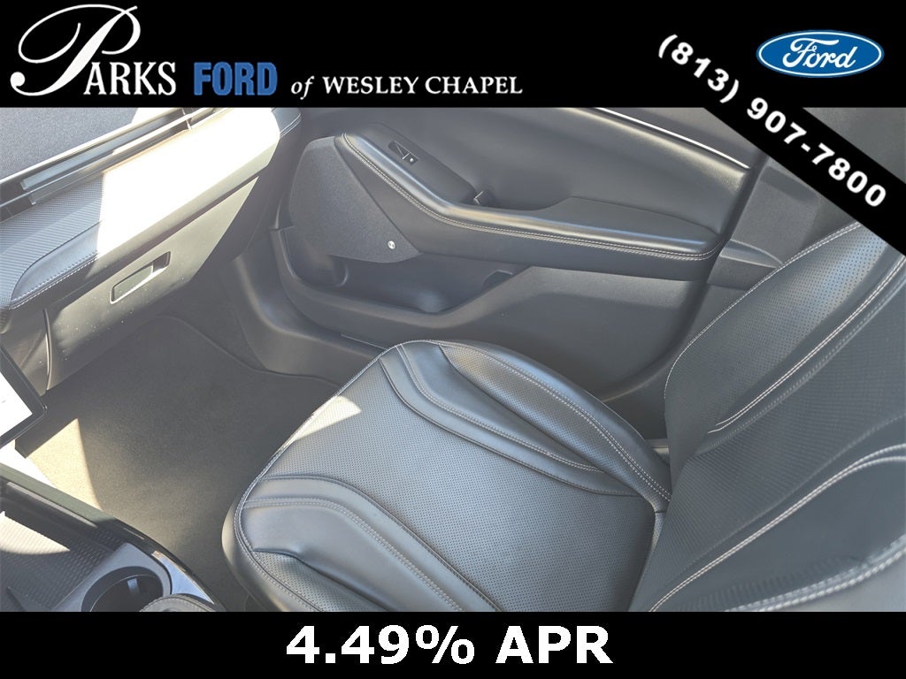 Finished in Shadow Black, this Mach-E Premium presents a striking, athletic appearance that blends classic Mustang cues with cutting-edge EV styling. Signature LED projector headlamps with sequential turn signals, LED taillamps, a sculpted fastback profile, body-color door handles with E-Latch push-button entry, and a rear spoiler give this vehicle unmistakable road presence. The panoramic fixed-glass roof floods the cabin with natural light and enhances the open, modern feel, while 19-inch painted aluminum wheels complete a refined yet performance-oriented stance.