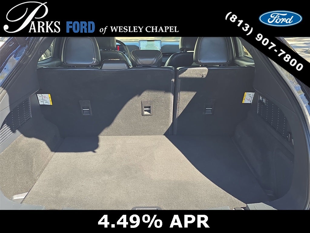 Inside, the Premium cabin blends modern luxury with intuitive design. Black perforated ActiveX seating surfaces, power-adjustable heated front seats with driver memory, a heated leather-wrapped steering wheel, dual-zone electronic automatic climate control, and ambient interior lighting create a refined, driver-focused environment. The 10.2-inch digital instrument cluster provides clear, customizable vehicle information, while the spacious second row and versatile cargo area make this Mach-E practical for everyday use.